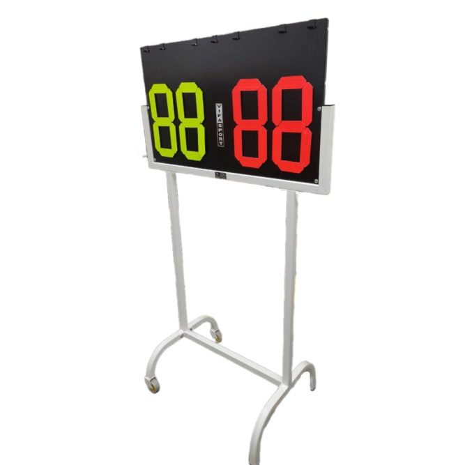 Điểm khác biệt của bảng điểm 2 số S358 so với 2 sản phẩm trên chính là có chân đứng khung sắt, sơn tĩnh điện chắc chắn và chống bong tróc. Bảng điểm ngoài tỷ số thi đấu còn hiển thị cả tên đội chơi.