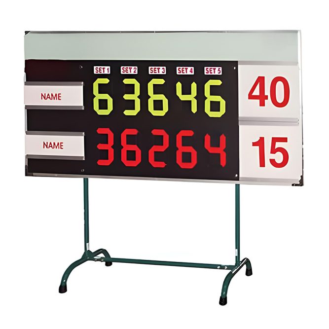 Bảng điểm thể thao môn tennis T370 là loại cao cấp có thiết kế cực chắc chắn chuyên dùng trong thi đấu chuyên nghiệp. Chữ số trên bảng làm từ nhựa, điều chỉnh bằng cách lật tay. Thông tin hiển thị trên bảng điểm gồm điểm số, set đấu, tên đội/người chơi.