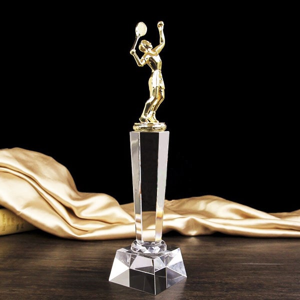 Chiếc cúp tennis pha lê có thân và đế là pha lê trong, đỉnh cúp hình vận động viên tennis đang ở tư thế vung vợt đánh bóng. Thân cúp có 5 cạnh được vát bằng nhau, tạo cảm giác hút mắt và tăng tính đẳng cấp cho giải đấu, phần thưởng. Cúp pha lê tennis có 3 kích thước: