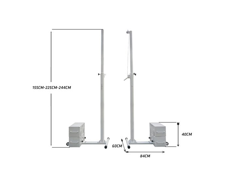 – Kích thước: Trụ bóng chuyền thường có kích thước từ 1,8m – 2,5m và hộp đối trọng có kích thước khoảng 40 x 60 x 30cm.